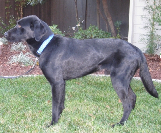 11/17/08 - 11/22/08: We are currently fostering this ~1 yr old male Black Labrador Retriever (looks purebred in the American/field-style with long legs and lean athletic body instead of the short/squat/blocky British style) left abandoned and very hungry at the Hollister shelter. The shelter folks called him "Jack" but his new owners can name him whatever you want.